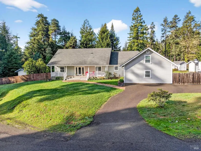 Single-story sunbelt delight, located on a 1.8+/- acre parcel close to all that the Mendocino/Fort Bragg coast has to offer. The 3-bedroom, 2.5-bath home features a desirable layout with the primary suite and additional bedrooms on opposite ends of the home. The spacious open floorplan is ideal for entertaining with vaulted ceilings, French doors leading from the livingroom and dining areas out to the covered west-facing porch down to a patio area, great for BB-Q's and gatherings around the firepit. The kitchen has solid wood, cherry cabinets, a pantry, and a propane range. The primary suite is extra spacious with an attached office area, double walk-in closets, and a sleeping area (TV's included) with a bathroom with double sinks, a soaking tub, and a walk-in shower. There is plenty of storage in the 936+/- sq. ft. 3-car garage with workshop and floor-to-ceiling cabinets. The paved driveway leads to the small orchard, RV hook-up area and access to the large yard surrounded by mature trees.
