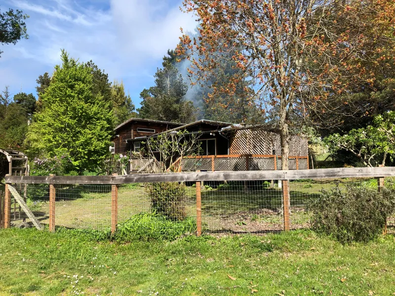 Charming bungalow located in the sunbelt, yet minutes from town. Originally, a one-bedroom home constructed with Red Cedar milled from the land. Renovated in 1997 to add a master bedroom, laundry room, and expanded bathroom plus an on-demand water heater and Generac back-up generator. Skylights and clearstory windows throughout for wonderful light. Propane space heater, wood stove, and an electric heater that also serves as an air conditioner and dehumidifier. Outside is a barn with tack room and two stalls for your four-legged friends. Carport with shed and hay storage. Two open decks, one with a hot tub, and also an enclosed deck area. Come set up your own homestead!