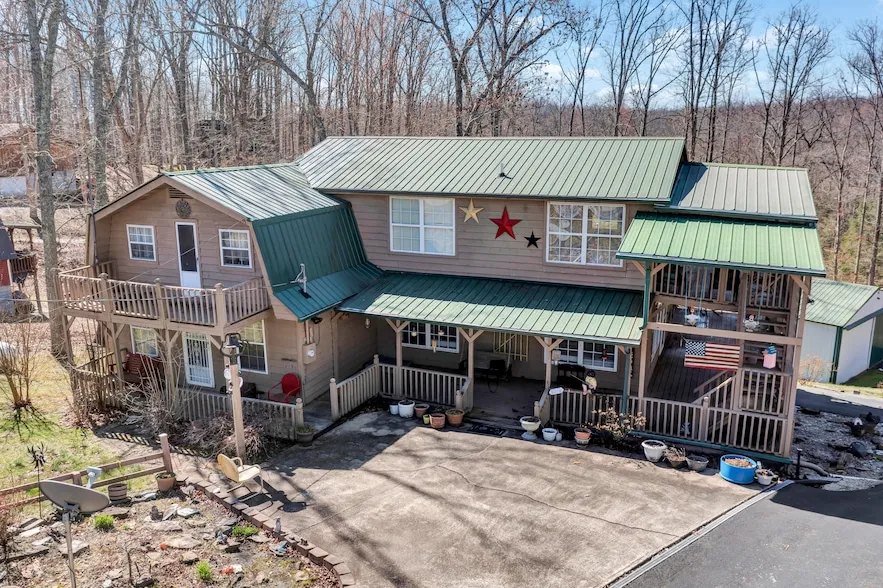 Lodge-Like Lake Home. Been dreaming of owning something around Cave Run Lake and Daniel Boone National Forest. Need S P A C E ? This is your chance. Within minutes of Longbow Marina, Bangor, Clay Lick and Warrix Boat Ramps. Large Sprawling 6 Bedroom 3 Bath home with open kitchen floor plan and DECKS GALORE! There's even 8 porch swings for all your friends. 2 heat sources and lots of storage for the toys in the massive approximately 30 x 40 garage. Possibilities are endless and waiting for your plans. Make your appointment soon as homes like this are rare.