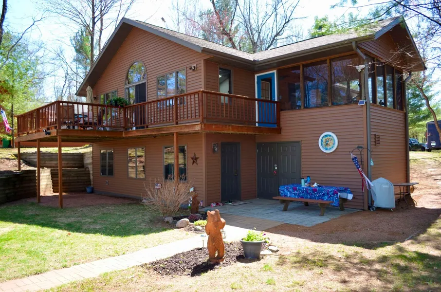 Welcome to your own private resort setting with 200' of gorgeous landscaped water frontage. Sitting across from natural conservancy land, your wildlife is abundant and your access to one of Legend Lake's main lakes is only seconds away. Nestled on a flat lot with a raised, wooded area, you have the beauty of both activity areas for volleyball, bags and other fun games but without the roar of all of the boats from the main lake. All you need to do to watch the fireworks on the 4th is back your boat up into the channel and you have a clear view of them. This open concept home was well thought out with walls of windows, a deck that gives you main lake views, and a three season room for a bug free game night or a cup of coffee. This year round house is situated in a quiet cul-de-sac.