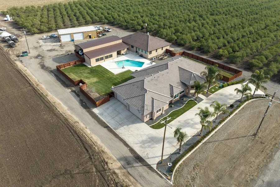 19.6 Acres in the McSwain School District with Approx 5617sf of 2 Custom Homes on a Young Almond Orchard. Gorgeous Main House w/ a Large, Open Floor Plan, Color Designed, & High Ceilings Throughout. This was Built 2015, Approx. 3079sf w/ 4 Bedrooms, 3 Bath, 4 Car Garage. Huge Gourmet Kitchen w/ 2 Kitchen islands, Granite Counters, Commercial Grade SS Appliances, Pantry, & More. Enormous Living Areas w/ Lots of Windows, Fireplace, & Multiple Dining Areas. Master Suite Has It All w/ Large Shower, Large Tub, & Large Walk-in Closet. This home is Energy Efficient w/ extra Wrapping, Barriers, & Insulations. Second Custom Home is 2058sf, Built 2019, 2 Bedrooms & 2 Full Baths. Large Great Room and Separate Sun Room. Custom, Quality, & Well Designed with Quartz Counters & Cherry Cabinetry Throughout. Kitchen Has SS Appliances, Large Island, & Large Pantry. Well Built w/ Extras including 2x6 Exterior Walls. It has an oversized 2 Car Garage. Game Room of 480sf w/ HVAC System, 12x12 Shed, & Full Hookups under this 39x60 Pole Barn for RV Storage. Metal Shop of 30x60 w/ Three Rollup Doors & Bathrooms. Approx. 17.5 Acres Nonpareil & Monterey Planted in 2015. Orchard has 2 Irrigation Sources, MID District & 30HP Ag Well irrigates in One Set w/ Micro Sprinklers. A Must See!