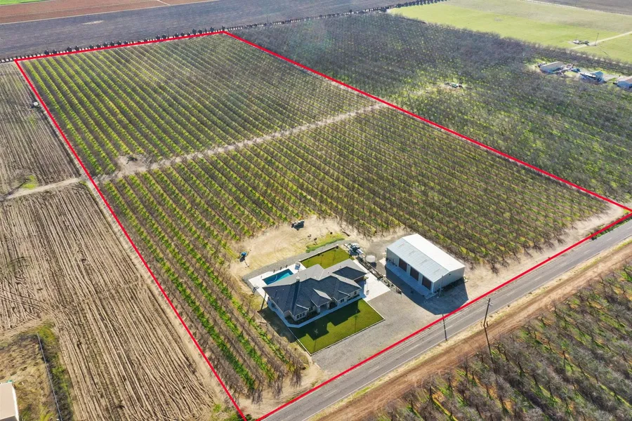 On nearly 20 acres this exquisite property boasts an extremely high-quality, custom-built home that epitomizes luxury and sophistication. Constructed in 2017 the residence is impressive at 3,162 sf. The grandeur of the home is evident with 10' ceilings (12' in the great room) and crown molding throughout. The great room features a propane fireplace for cozy gatherings. The kitchen is a culinary masterpiece, with granite counters, a gas range, a separate oven and microwave, and even a wine refrigerator. The property offers versatile living with five possible bedrooms. The master bedroom is a haven of relaxation, spacious enough for a sleepover with all the grandkids! The accompanying master bath and closet are equally impressive, providing ample space and luxury. The pool (installed 2022) will welcome you this summer and has an automatic cover, is 9' deep and has an Acapulco deck with an umbrella holder. An Independence variety almond orchard provides beauty and potential out back. A new ag well is shared for cost savings and is powered by TID for lower energy cost. There is a 50'x80' shop, with four roll-up doors, drive-through RV, laundry hookups, a bath with shower, hot water, and 220/3 phase power and RV dump. A 10 hp submersible pump and 350' well supplies domestic water.