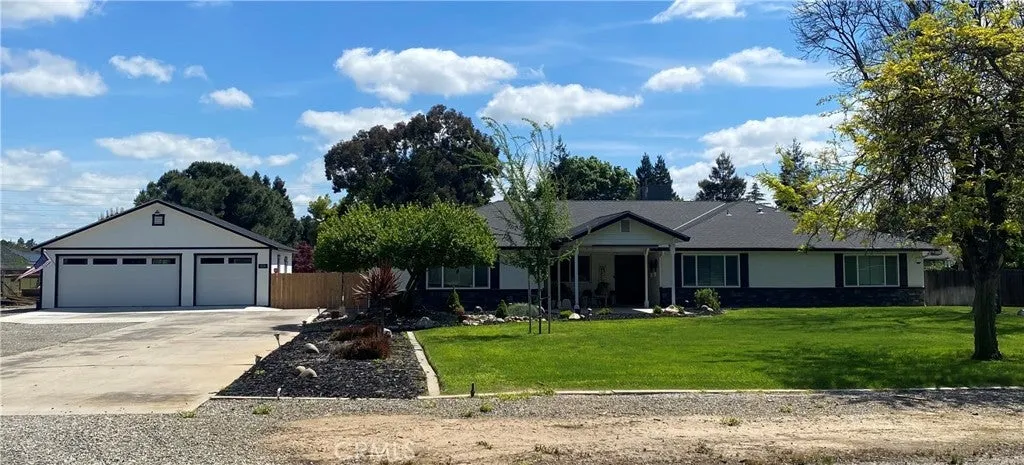 This Home is a WOW! Welcome to your picturesque retreat! Nestled on a sprawling 1-acre lot, this recently remodeled home exudes charm and sophistication. Beautifully constructed covered porch with designer touch leads you into the formal entryway. Gleaming hardwood flooring lead you through an inviting open floor plan. Entertain guests in style. in the formal dining room and spacious living room, or gather for a cozy evenings in the large family room. The remodeled kitchen is a chef's dream, boasting modern amenities and ample space for culinary creations. Convenience meets luxury with mudroom/laundry room for everyday organization. Retreat to the primary suite, featuring a completely remodeled bathroom for ultimate relaxation. Two additional bedrooms offer comfort and versatilely for family and guests. Summers are made for enjoyment with an updated pool and stamped concrete patio perfect for outdoor gatherings. Newly constructed 3 car detached garage/shop adds storage and perfect for gym and or work space. Surrounding the home, a sprinkler and drip system ensures lush greenery year round. You can enjoy fresh fruit from numerous fruit trees and a large garden for fresh veggies. Experience the epitome of modern living thoughtfully updated home.