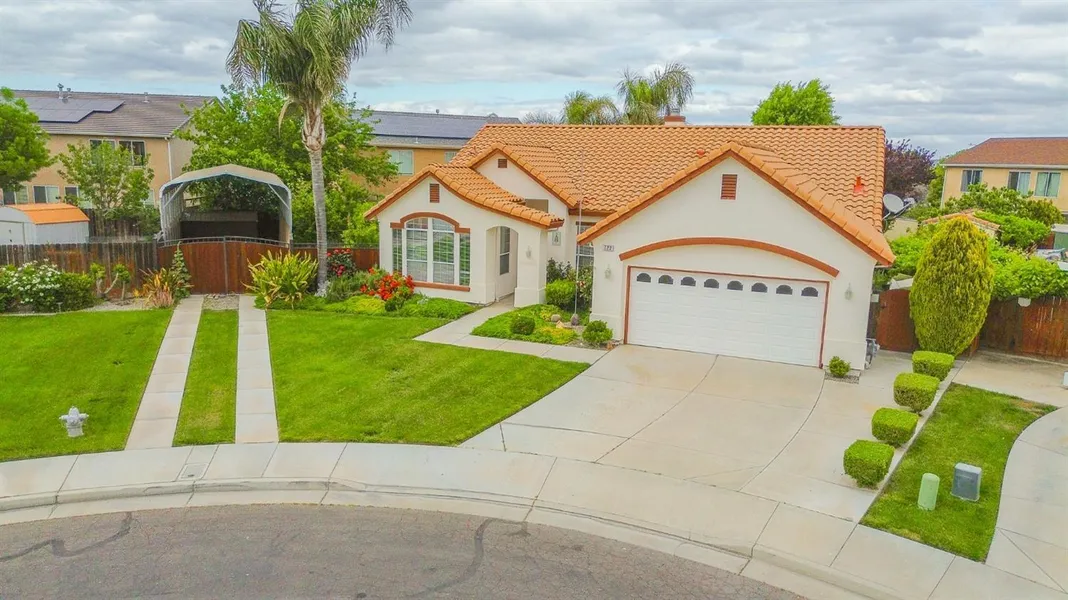 Welcome to 722 Ruddy Ct! This beautiful home features a spacious kitchen with an eating area, abundant cabinetry, a dual oven, and a cooktop. The formal dining and living room combination boasts high ceilings, a cozy fireplace, and a built-in bar with elegant glass shelving. The extra-large master bedroom includes a walk-in closet and a luxurious master bathroom with dual sinks, a separate shower, and a sunken jetted tub for ultimate relaxation. Enjoy an expansive backyard filled with a variety of fruit trees, grapevines, and multiple outdoor structures, including a building with its own kitchen, eating area, bathroom, and cellar perfect for guests or entertaining. Additional storage is available in a couple of custom-built sheds. Convenient RV parking with a portable cover is also included.
