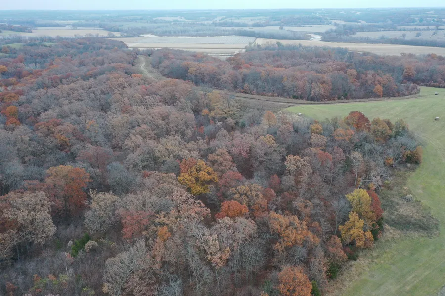 The east part of the farm is perched on the hills and bluffs overlooking the Weldon River bottoms that are brimming with corn and soybeans. This area consists of predominately hardwoods timber including many white oaks, and there are also several open acres for food plots or row crop; it's estimated that there is potential for 100 acres m/l of tillable, providing a nice income and tremendous food source for wildlife.
