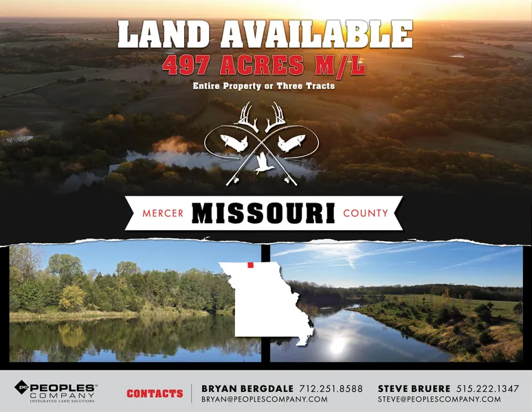 This northeast Mercer County, Missouri property includes 497 acres m/l with 282.71 DCP cropland acres carrying an NCCPI rating of 57.3. Approximately 44.68 acres are currently being farmed. Comprised of predominantly Armstrong loam and Gara loam soil types, this farm could be utilized for a multitude of income potentials, ranging from row crop production, pasture ground with perennial cool-season forages and paddocks for grazing cattle, or with the diversity of heavily wooded timbered draws and abundant water sources foster premier recreational opportunities for all species of wildlife! The expansive woodlands and open areas are perfect for upland game birds, turkeys, and Missouri whitetail hunting with multiple access points and varied topography that provide ideal setups for both bow and gun hunting alike. Implementing food plots and strategically placing tower blinds will ensure excellent gun-hunting experiences for all ages of hunters - both young and old! This outdoor paradise is east of Muddy Creek and equipped with four stocked ponds of game fish each accessible by a boat ramp, which allows for endless hours of possibilities of chasing that "trophy" lunker bass or hunting with friends and family during the numerous Missouri waterfowl seasons.