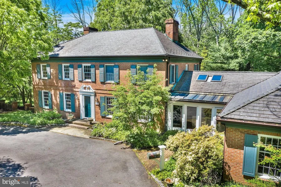 A magnificent, brick colonial manor home, built in the coveted and tranquil western section of Princeton, masterfully blends tradition with a spacious open floor plan. Seamless functionality is at the heart of this home, located on a quiet cul-de-sac, just minutes from the charm of Princeton. A circular driveway brings you to a home with high ceilings, bright windows, and gleaming hardwood floors. A grand, main entrance foyer leads into a great room, with wood-burning fireplace, separate wet bar room, and brick sunroom, with french doors that swing open to a rambling large, wood deck. The library, surrounded by built-in bookcases and charming window seat, is a perfect location to study and read. The elegant, large dining room is nearby, perfect for a family holiday dinner. Professional style gourmet eat-in kitchen with two islands, granite counters, stainless steel appliances, built-in oven, cooktop, skylights, and a sunny breakfast room allow views of lush, private woodlands. Adjacent to the kitchen is a spacious laundry room with sink and countertop for folding, leading to the two car attached garage with exterior power generator. A first floor artist studio, office, play room or in-law guest area with its own entrance, sliding doors and full bath, enhance this versatile living space. An inviting circular staircase with an open and spacious landing, lead to the master bedroom with full master bath and 3 additional bedrooms. A full hall bath complete this level.Retreat to the lower level finished basement with walkout, which leads to the park-like backyard. The lower level offers a large space with multiple uses such as, media room, family room, play room, guest or in-law room. It includes a brick fireplace, built-in desk with shelves, kitchenette, gym with hot tub, and steam shower with full bath. This peaceful 1.5+ acre property is within walking distance to Princeton~s best shops and restaurants, McCarter Theatre, Princeton University, and is minutes from local schools, major highways, and trains to NYC or Philadelphia.