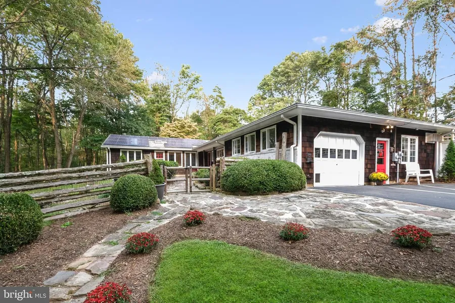 Nestled on 7.5 serene acres in the beautiful countryside of Hopewell Township, this special home offers country charm, privacy and just a bit of whimsy. Whether for use as a full time residence, weekend retreat or the quintessential work from home space, this timeless ranch has it all! Down a meandering driveway and set on a gentle hillside, a flagstone pathway invites you into the spacious, light filled living room complete with warm wood flooring, a wall of windows and a custom built in bookcase. Tucked perfectly off the living area is a private office where your workday will seem effortless as you enjoy natures scenery, compliments of your private woodland setting. Completing this wing of the home are stylish French doors leading to the master bedroom suite featuring double closets, a private bath and a nearby linen storage closet. The eat in kitchen offers white cabinetry accented by bead-board wainscoting, open shelving, recessed lighting and stainless steel appliances. Entertain and create lasting memories with family and friends in the expansive formal dining room showcasing an impressive stone fireplace, built in bookshelves and a large picture window. Finishing this area of the home are two additional bedrooms (one with a Murphy bed), the second full bath, walk in closet with a laundry chute and an updated powder room. Located to the rear of the home, possibilities abound for additional work or hobby space. Found here are two enormous workrooms complete with shelving and storage cabinets, a stackable washer/dryer, splash sink, rubber flooring and separate heating and air conditioning units. Animal lovers will be delighted to discover three adorable custom made dog kennels each with doggie doors that lead to individual fenced backyard exercise areas. The custom designed outbuilding is constructed with Hardyboard siding, running water, two large kennels and a radiant heating system. This unique space would serve well as a private artist studio, potting shed, possible farm use, exercise room or whatever need you may have. Additional features include fresh interior paint in most rooms, an attached one car garage, full basement, recent roof, solar panels, whole house generator, several split AC/Heating units, 3 zone heat, security system, fire pit, split rail fencing and two Murphy beds. Possibility for farmland assessment. Lovingly maintained with improvements galore, this special home is sure to please and has so much to offer its fortunate new owner.