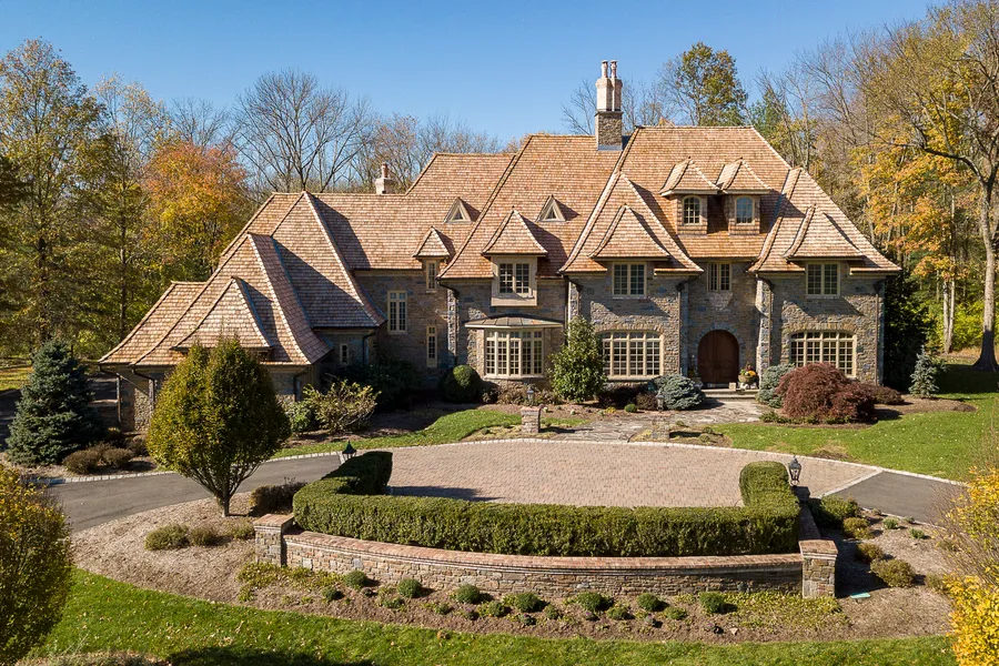 The Rushbrook enclave is known for spacious homes of distinction and this English-style residence, clad in stone, is perhaps the most picturesque of them all. Perched on a wide lot just shy of 3.5 acres, it is wrapped in woodsy privacy on three sides. Renowned Barsky Builders, skilled at creating custom spaces that make entertaining easier and everyday life a bit more indulgent, did not hold back on architectural features. A corbeled archway in the foyer and a recessed oval ceiling in the dining room make a striking impression, but such details are not just for formal rooms. The open family room off the gourmet kitchen awes with a rounded two-story window and a paneled wall to match. While a sunroom lined with French doors and fanlights sparkles with light, the adjacent library's rich wood paneling and coffered ceiling are completely enveloping. Seven bedrooms all have custom closets, in...