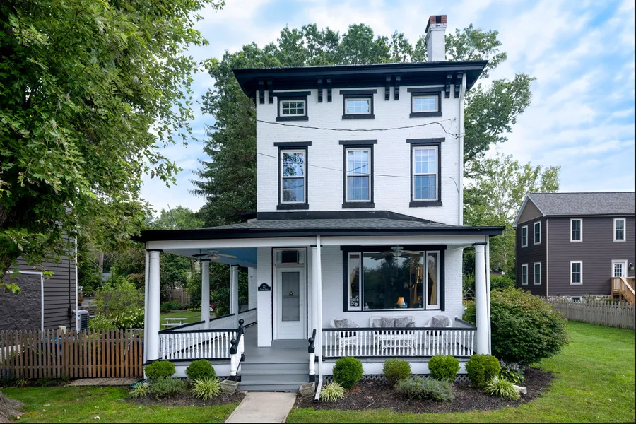 River Front Estate with water views and water accessibility are spectacular. Enjoy them from the wraparound porch and big picture windows of this 19th century brick home perched on the sweetest little lane along the Delaware River. The best part is that the river’s not just lovely to look at, you also have access to the water with the ability to add a dock. Kayak, canoe, jet ski, fish - enjoy whatever floats your boat! Just stroll across the sleepy road, where a grassy knoll dips down to the shore. The house is surprisingly airy and open for being built in 1860. The ceilings reach nearly 10 feet and the living spaces are positively enormous with well preserved hardwood floors. The front room is lined with a fireplace, window seat, open shelving and an enclosed bar. Through the dining room, a galley kitchen with classic black and white checked tile has no shortage of cupboard space. A newly renovated full bath on the main level is especially handy for a quick rinse after a day of water sports or a bike along the towpath, also steps away. The upstairs bathroom serves three bedrooms, the largest of which offers a dressing room with cedar-lined closets. Should you dream of your own private sanctuary overlooking the river, the third floor is brimming with potential. In its current state, two separate rooms accommodate both work and play. This river retreat is just waiting for your personal touch!