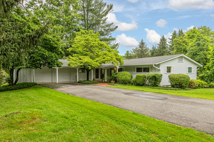 A quiet street edging Princeton Battlefield Park is home to this mid-century modern sporting crisp white paint and a newer roof and HVAC. The tidy ranch-like appearance belies an interior featuring a stunning great room and abundant woodwork that hides a wealth of smart storage. Enormous windows rise up to meet the peaked, beamed ceiling crowning the open heart of the home, where a fireplace is set within a whole wall of contemporary built-ins. While some facets of the sizable, eat-in kitchen are ready to be modernized, the handsome walnut cabinetry is exceptionally well-made and two sinks are a helpful perk. Streamlined storage lines the hallway leading to two big bedroom suites, as well as an extra full bath. An open staircase descends to a walk-out lower level that’s just as surprising as above! A kitchenette, laundry and fourth full bath present the option of apartment-style accommodations for guests or multi-generational households. Across from the bedroom, a big cedar closet keeps seasonal clothing and keepsakes protected, while an additional room holds any overflow. The garage has an attached shed for lawn gear and games, which you’ll definitely want to keep handy for use in the big backyard, which is bordered by lovely trees. A balcony, patio and covered front porch are more great spots to enjoy the scenic views!