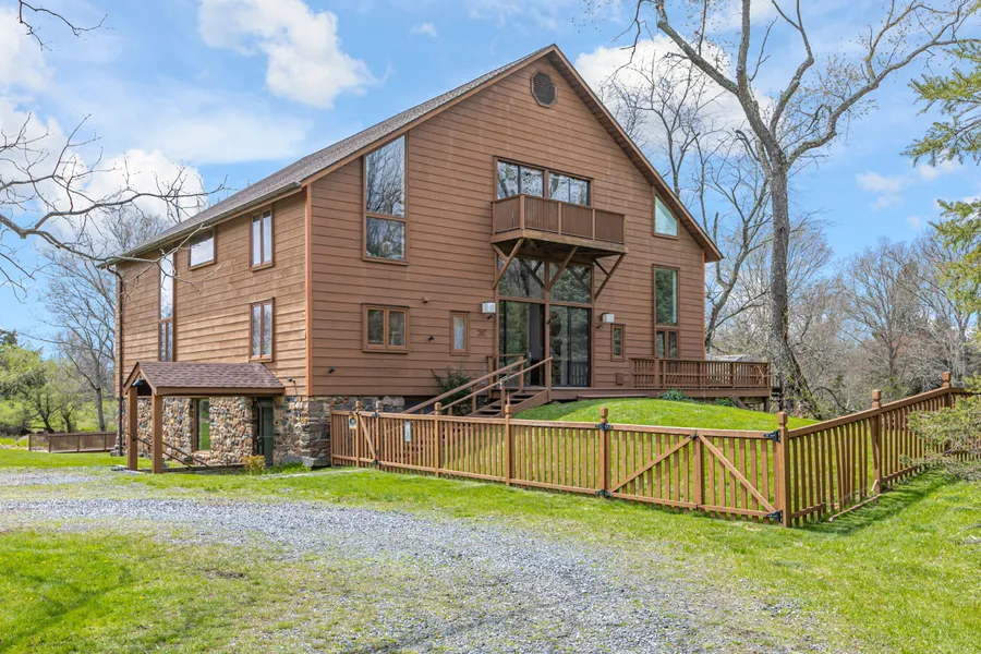 With the D&R Canal edging one side and preserved natural land bordering the 3 other sides, this peaceful, offering has that worlds-away country feel within 47 miles of NYC and 8 miles of Princeton. The masterfully converted bank barn has views of a working Christmas tree farm, on a lot of its own and adjacent to a pond and stream. Presenting the chance to live in one-of-a-kind comfort, the dramatic stone and clapboard barn is full of rustic contemporary allure thanks to the talents of renowned local architect, Jerry Ford. Huge beams accentuate soaring ceilings and oversized windows welcome in light and protected views of the grounds. Some space is wide open, ideal for gathering groups. A library, featuring floor-to-ceiling bookshelves, and a study with a reading nook, are cozy spots to escape. The upper bedroom suites are beyond spacious, while the ground floor offers guests the independ...