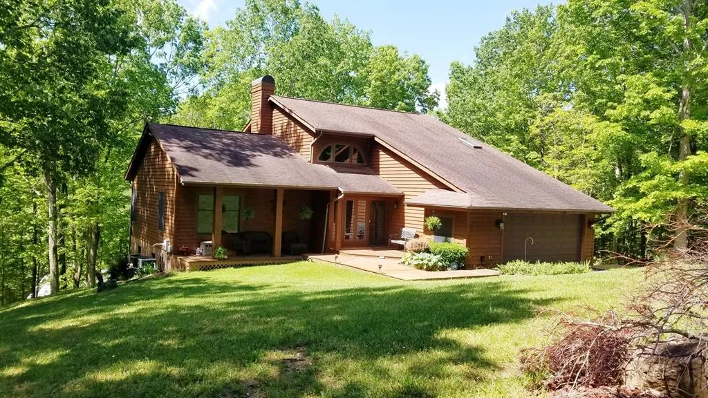 Nestled on a private wooded lot, this cedar and brick contemporary home has wonderful open living areas inside and massive decking for outdoor enjoyment. Stone fireplace, stacked windows in the 2 story great room with wooded and mountain views is nothing short of peaceful tranquility. Private master suite with over sized whirlpool tub features more enjoyable views into the woods from unique angular windows. Finished walk out lower has a family room with fireplace, 4th bedroom and full bath. Excellent closets and storage areas inside and under deck utility storage outside. New heat pumps and upper level gas furnace.