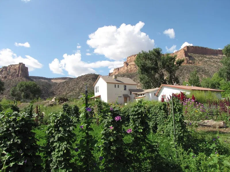 Designed by the owner to make the most of the particular location, and maximize the privacy of outdoor spaces, it mixes the scientific process of rapid soil development with all the wonder and beauty appropriate to the setting. Views of the towering sand stone cliffs of the Colorado National Monument are visible from the dining table, great room, living room, deck and master suite. The house, gardens and pastures are the culmination of more than 60 years of gardening for herself and others, a BS in Plant Ecology, the study of permaculture values and practices, and regenerative farming practices.