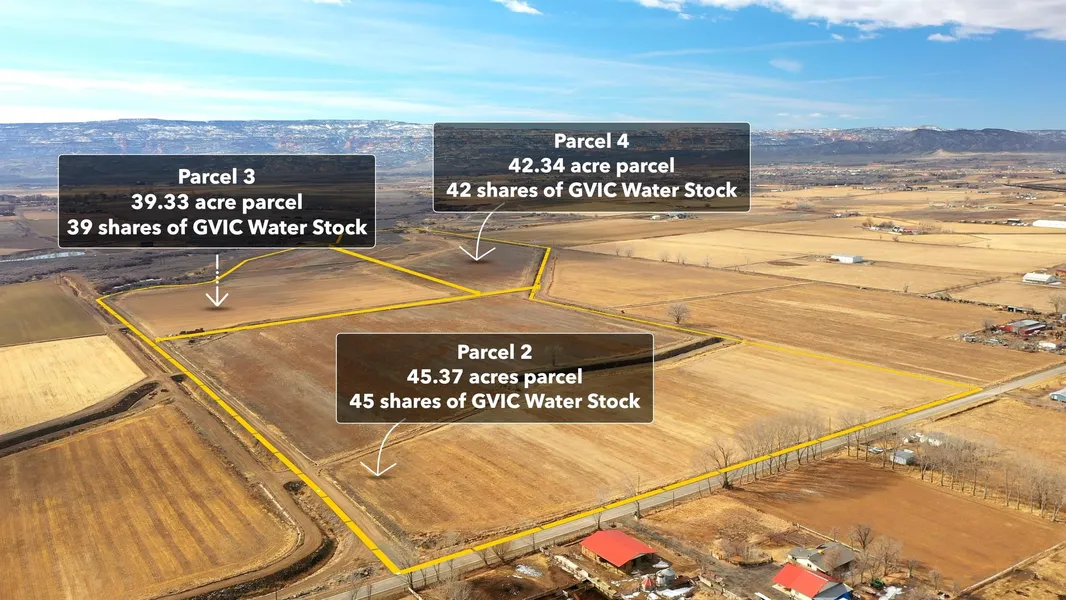 Lot 4 42.34 acre parcel with 42 shares of GVIC Water Stock Lot 2 45.37 acre parcel with 45 shares of GVIC Water Stock Lot 3 39.33 acre parcel with 39 shares of GVIC Water Stock Combination of gated pipe and siphon tubes for irrigation system. Great views in every direction, good farm ground and located just a few minutes from Fruita. For those that are wanting the rural lifestyle and enough land to be able to raise livestock, grow feed and have your own homestead. Close enough to Fruita but far enough away that you are " in the country"