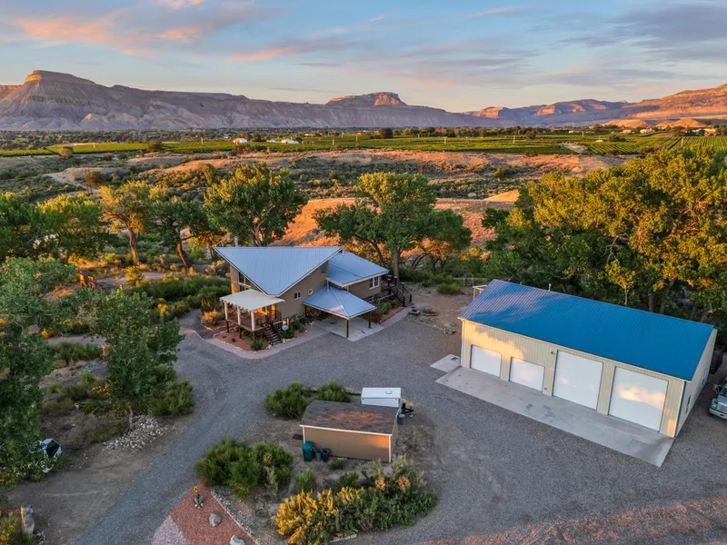 Sometimes there is a home out there that just has everything you could ask for. Who wouldn't want views, privacy, uniqueness, & tons of additional amenities, including the famous Garage Mahal? You're going to want to come see this Palisade property on 3 parcels totaling almost 25 acres. For starters let's talk about the peace & quiet you'll find in this tucked-away oasis. Not a peep of traffic can be heard around, and the wildlife will be a joy to watch. That's just an appetizer though, as the home offers an extremely unique flair. The pergola covered deck is easily the perfect spot to watch the sunset over the Monument. Step inside to find a distinct living space. The ceilings soar, the massive windows bring in loads of light, & a wood burning stove offers a cozy touch. Up the stairs is a delightful loft space that looks out over the living room, & can be used for a variety of purposes. The kitchen/dining area has massive appeal! Granite countertops, stainless steel appliances, classy backsplash at the range oven, & the cherry on top: the views! Enjoy a meal while you look out at the truly picturesque Bookcliff mountains. The large primary suite has a lot of room to stretch out & relax. The wall sconces provide atmosphere & bring a luxurious touch to the room. The four piece en-suite bathroom has some nice fixtures, granite countertops, a large walk-in shower with some great accents, & access to a walk-in closet. Down the stairs, the finished basement has an additional living space, two additional bedrooms & a full bath. An additional space houses the laundry & is ripe with potential for whatever use you can imagine (it has plumbing stubbed out). Outside, one of the staples of this property is appropriately nick-named Garage Mahal. It's an oversized four-car shop that has even been featured in local ads. It comes complete with heating and cooling, two RV doors that will allow for some large vehicles or equipment, a car lift for easy auto maintenance, & a loft for some additional storage. Down the way is a 2nd shop that has plenty of storage & room for equipment of all kinds & purposes. This property will have you ready to settle into any machinist undertaking with ease. As an added bonus, the yard has some xeriscaping completed, and some additional gardening that has been set-up for your own green touch. There is even more that could be said about this home, but you'll just have to come & see!