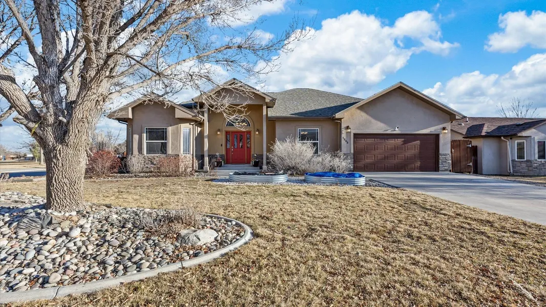 Beautiful stucco home with OWNED SOLAR PANELS. This home is on a large corner lot and when you walk into the entry way you will feel right at home! Vaulted ceilings and gas fireplace in the living room lead into the amazing kitchen with attached dining room. Make the open room your own by using it as an office, den or playroom. A split bedroom design with a big primary suite with a 5-piece bathroom and a garden tub. Located in a very desirable Fruita location, close to amazing outdoor recreation! Schedule a showing today!