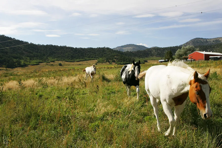 Western Colorado horse property: spacious 5-bedroom home on 24 acres has outstanding equine improvements, including round pen, outdoor arena, and 3-car detached garage. The property is well fenced, much of it with 2 3/8" steel pipe fencing in very good repair, and the west side of the property borders BLM lands that in turn border National Forest. Hunting is excellent for mule deer and elk in the Kimball Creek area (Colorado GMU 421), and the owner's daughter has taken a trophy bull elk right on the ranch. The Battlement Mesa is just a few miles north of the property, with access to many thousands of acres of high-country terrain for horseback riding and hunting. The property comes with #1 priority water rights out of Kimball Creek to irrigate the horse pastures. Mineral rights are leased, but the lease is about to expire and will revert to the owner. Schools in the local area are very good, and Collbran has a bank, hardware store, small grocery store, and a couple of restaurants. All major services, airport, and big-box shopping are available in Grand Junction, 44 miles west. Adjacent 24-acre property has a huge indoor arena and large shop building with 4 large stalls. Both properties are available as one option.