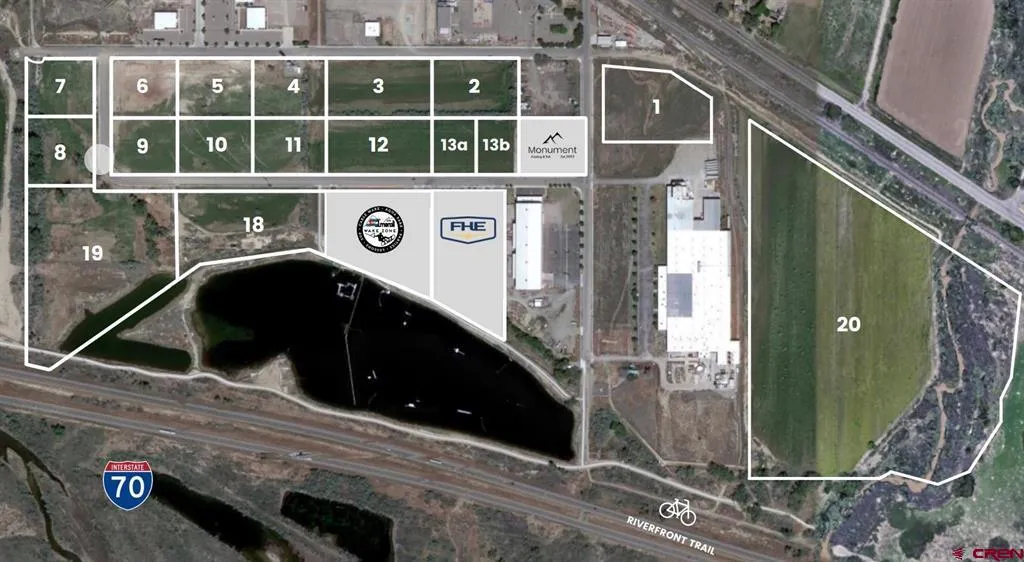 Unique lake view property nearby the Rocky Mountain region's premier water sports adventure park (Imondi Wake Zone). This 10.36 acre parcel located in the Fruita Business Park has visibility from Interstate 70. Easy access to the popular Colorado River Front Trail from completed sidewalks within business park. Downtown Fruita to the East and the World Class Kokopelli Trail System to the West is accessible within minutes by car or bike from this parcel. Industrial zoning allows for various allowed and conditional use opportunities. Reference the Fruita Land Use Code for possibilities.