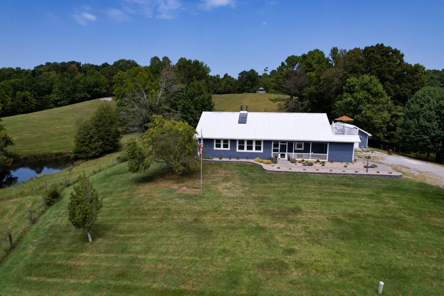 Escape to the epitome of serene country living with this meticulously maintained estate sprawled across 70.68 acres in the charming Metcalfe County, Kentucky. A winding 1/4 mile driveway welcomes you to this inviting residence with professional stonework landscaping. The home boasts two spacious bedrooms and two well-appointed bathrooms, encompassing 2,592 square feet of comfortable living space. Upon entering your home, you are welcomed by the exquisite allure of hardwood floors, which provide both beauty and functionality. The heart of the home features a large open-concept living room with stunning views over the extensive property and seamlessly connects to a delightful kitchen and dining area, perfect for entertaining family and friends. The kitchen comes equipped with a large island with induction stovetop and convection oven as well as an authentic Elmira wood stove offering a choice of modern and traditional cooking options.