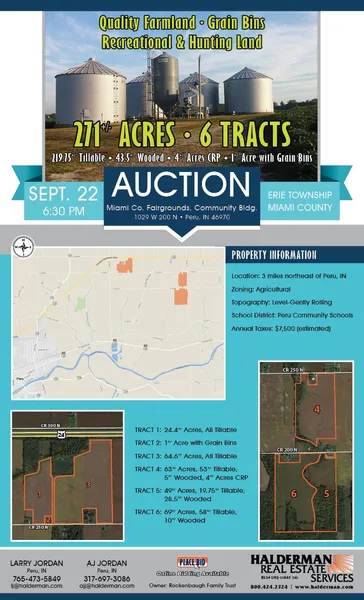Legal Description: Part of the E1/2 SE1/4 Section 8, T27N, R5E (63 acres); also part of the NE1/4 of Section 17, T27N, R5E (119.18 acres); also part of the W side of the NE1/4 of Section 7 and E part of the NW 1/4 of Section 7, T27N, R5E (;87 acres). All in Erie Twp, Miami Co, State of Indiana