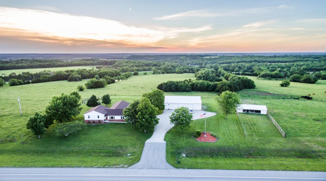 This beautiful estate is a picturesque setting and is your chance to own your own American Dream. A perfect white house and huge workshop out in the country sitting on a very nice 94 acres. The house has been extremely well maintained and freshly remodeled. This 3 bedroom and 2 1/2 bath house is immaculate. The kitchen has a very modern look and feel with lots of counter top space, cabinets, and newer cooktop stove and a view out to the great room which is the best feature of the house. The great room has lots of windows, a full length bar, complete with an in-counter wine chiller, a full size beverage refrigerator, and flat screen tv. The rest of the room has cozy leather sofas wrapped around the room to create the ideal entertaining or family relaxation spot. At the end of the great room are two french doors that open up to the covered deck that has a built-in hot tub and the most incredible spot to watch the sunset over the farm. The house has a nice master bedroom with attached master bathroom that has been just remodeled and is basically brand new. There is an additional deck with a walkout attached to the master suite with awesome views out to your farm that gently rolls away from the home. The upstairs is rounded out with two other large bedrooms complete with lots of closet space, and a very nice full bathroom for them to share. There is also a living room and a family room with a very efficient wood burning stove as the focal point and guest bathroom. The 50x70 workshop is every man's dream. Several large garage doors, two of which have electric openers, that offer access to pull any vehicle or tractor in and out with ease. The owner has a truck lift that makes changing oil or just tinkering on your hobby car a joy to work on. There is tons of storage space and plenty of room leftover for a workshop. The shop has 220 amp service, insulated, heated, almost all concrete floors, and plumbed for water. The land is in great shape and there is a great stand of grass that has very obviously never been over grazed. The west side of the farm is all fenced, has two good cattle ponds and small blocks of timber that do offer deer and turkey hunting opportunities. The east half of the farm is mostly unfenced and used to cut hay. This side could easily be turned into row crops, fenced for additional pasture, or just continued for hay. All of this and under an hour drive from Kansas City. This farm is your chance to start your own American dream.