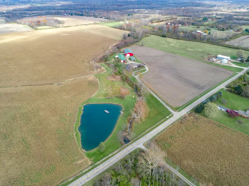 Great farm ready for you to move in and go! 81+ acres with pond, running stream and approx 75 acres tillable. Three outbuildings including new 60 X 120 Amish built barn w/2 overhead doors w/openers. The 5,200+ sq ft home offers a great floor plan for large gatherings, a great room with cathedral ceiling, brick fireplace open to large dining room w/Bay window and kitchen featuring loads of cabinets and counter space plus an island with cooktop, highlighting the kitchen is a brick wall fireplace and brick oven. A long hallway leads to the master with on-suite featuring double vanity, double shower and walk-in closet. Two ample size bedrooms on main floor with a forth bedroom and storage upstairs. Newer hardwood floors thru-out the main floor. The full finished w/o lower level offers a wet bar, 6 booths, a family room and rec room, the perfect place for entertaining. Relax on the Trex Deck(14 X 60) over looking the tree lined running stream and pond. The property has it all!! Seller is willing to divide the property by selling the home with 5-10 acres to include the outbuildings, pond and running stream for $549,900 and the remaining approx 75 tillable acres for $700,000. Call for details.