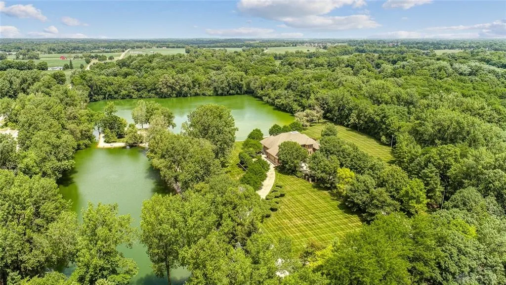 Rare opportunity to own approximately 9,600 sq ft of finished living area with a gated entry, almost 20 acres of absolute beauty offering a 12 acre private lake stocked with fish, shelter house with electric, gazebo, landscape pond with waterfall, covered veranda, lower level patio, gorgeous landscape, and irrigation. The immaculate interior offers high ceilings on the first floor, with beautiful custom ceiling details in nearly every space of this spectacular architectural home. You will find floor to ceiling glass, columns, arches, elevator servicing all 3 levels, and gorgeous trim work throughout. Luxurious and private first floor primary suite is to die for. Walk-in tile shower, granite, jetted tub, his and her vanities and walk in closets, private commode space with additional vanity space, beautiful ceiling (14) with accent lighting, gas fireplace, and doors leading to the covered veranda. Custom built office with built-ins and dual sided gas fireplace sharing with the living room with soaring 19 coffered ceiling with stained woodwork. As you enter the grand foyer, you will take the gallery space to the formal dining, and then you will find the beautifully designed powder room, large laundry room with abundant storage spaces. The leisure room is grand with unique ceiling, all open to the nook and chefs kitchen. The kitchen is offering commercial grade, stainless steel appliances (Dacor Gas Range with Double Oven, Vented Hood, Dishwasher and Refrigerator). Upstairs offers 3 bedrooms, one ensuite with private bath and two with a shared jack and jill bath. Serene views from every part of this stunning and spectacular home. Walk-out lower level offers media area with gas fireplace, massive wet bar (seats up to 10), full kitchen, game areas, full bath, and loads of natural light. Three car attached garage is heated. Morton building offers abundant storage, 3 garage doors, heat, electric , and water. Also a covered patio space and a basketball court.