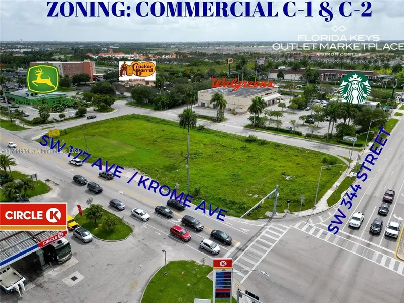Land Lease: Exceptional corner parcel on very busy intersection. Corner of Krome Ave - SW 177 Ave and W Palm Dr - SW 344 St. Ideal for Retail, Restaurant, Bank, Medical Center, Urgent Care and Fitness Center. 1.24-acre site zoned General Commercial C-1 and C-2. Offering a Ground Lease at $3.8 per square foot, $205,823 annually. One block from US-1 & FL Turnpike (Gateway to FL Keys). Surrounded by Walgreens, Starbucks, Cracker Barrel, Home2 Suites by Hilton and Circle K gas station. Just blocks from Florida City's City Hall and Police Department. Numerous hotels and quick service restaurants are nearby, including Ramada, Best Western, Burger King, KFC, Denny's, Dunkin' Donuts, etc.