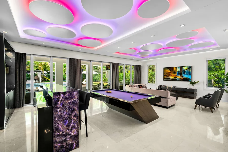 Welcome to this exquisite gated 2-story modern sanctuary. Cross the threshold and enter a world of luxury as you step through the grand foyer into a sprawling layout showcasing elegant formal living and dining areas, perfectly complemented by a spacious gourmet chef's kitchen. Ascend to an elevator to discover 4-suite bed rms, highlighted by a luxurious master suite featuring a sitting area, dual sinks, separate shower, and spa whirlpool, along with 2 walk-in closets and balcony access. Additional features include smart home features, entertainment area with a bar, wine cellar, home office, and home theater. Sliding doors lead to a tropical retreat, complete with a playground, mini golf area, 3 covered terraces furnished with seating, a separate guest house with a mini hair salon.
