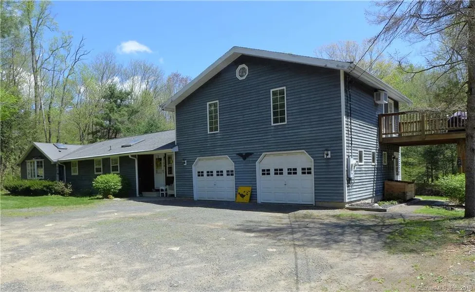 Another Price Reduction!!! Seller motivated!!....Beautiful private setting offering one floor living with rental or in-law apartment over garage. The Menunketsuck River flows through back yard & provides a little waterfall into small pond affording views from the house & patio. The main house has 2 great party rooms with cathedral ceilings, skylights, open beams, stone fireplace, wood stove & they open onto a wrap around deck overlooking the pond. Kitchen has newer stainless steel stove & refrigerator. There are built in bookcases. It is all set for central air...just needs a compressor. The apartment over the garage has an open kitchen, dining area & living room-which opens to a deck. It has electric heat & a pellet stove. The town has classified the property as a legal 2 family, so you have choice to rent( with income of $2500/month), have in-law or guest quarters. State Forest is right across the road. Property is also listed as a 2 family.