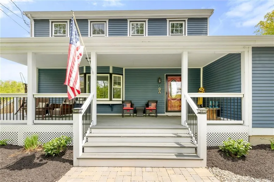 THIS IS THE ONE.This home checks everything on your wish list and more! Charming New England Turn-key 3BD/3BA colonial style home sited on lush nearly 2 acre well appointed lot.This home features a full wrap around front porch with stylish railing and trim complimenting the picturesque exterior grounds.The first floor has extra wide solid hardwood flooring in living spaces,a bay window in the living room,French doors in dining room leading to a 14x14 deck connecting to wrap around porch.The kitchen is fully remodeled with custom cabinetry, tile backsplash & fully equipped with center island,coffee bar,under cabinet lighting and recessed lighting.A wet bar with cabinetry for a wine enthusiast sits thoughtfully located between the vaulted family room ceiling detailed w/shiplap &brick masonry wood burning fireplace.Upstairs you will find 3 large BDs,a primary ensuite with dual closets ,renovated primary bathroom &main bath along w/flex space currently used as a home office.Wait ! There's more! Off the den/ family room through the sliding glass doors is a huge covered patio with outdoor kitchen,stone pavers ,stone sitting wall, & fire-pit for the ultimate outdoor living experience. An above ground pool,storage shed and professionally landscaped plantings make this home a complete exterior oasis.