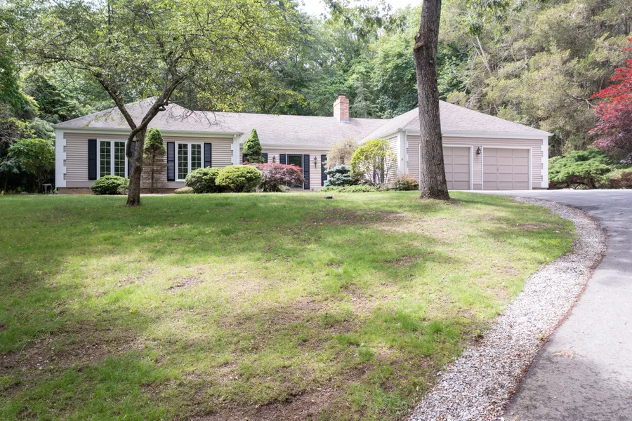 Spacious ranch situated on 1.5 acres located in a neighborhood. When you walk in the front door you will be impressed by the expansive sunken living room featuring a 9ft ceiling and fireplace. The fireplace has three hearths/openings located in the family room, the living room, and the kitchen. There is a formal dining room off of the kitchen and living room. The eat-in kitchen has granite countertops, an island with double sinks, oven/microwave units in the wall, and a large pantry. Just off the kitchen is an enclosed three season porch with sliders to the garden. Downstairs from the kitchen is the finished basement that can be used as a family/game room. All of the bedrooms feature walk-in closets. The primary bedroom suite has an area for sitting or office with an en suite. The back yard is level and the large sliders throughout make you feel connected to the outdoors. The expansive patio is a nice feature for entertaining. This home is close to everything Old Saybrook has to offer with its many shops and restaurants. The town beach is about a ten minute drive and there is also easy access to the highway. Generator, central air and oversized two car garage.