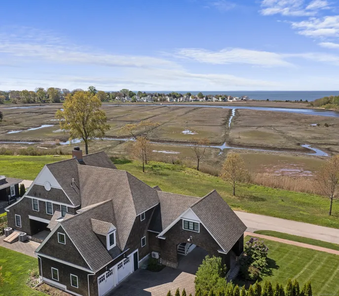 Welcome Home! This stately Nantucket shingle- style home is located on the most premium lot in The Hammocks-the picturesque 55+ community of beautiful homes close to town, marinas and beach. This residence offers endless views of the Hammock River, Salt Marsh, Long Island Sound and Clinton Harbor from every vantage point. Gather with friends on the spacious bluestone patio for a front row seat to the summer fireworks and experience beautiful sunsets all year round. The exterior is classic New England architecture with a lovely porte-cochere, 2-car garage, ample parking and private paving stone driveway. Enter into the formal foyer and notice the gleaming hardwood floors and 9-foot ceilings. Large windows flood the home with natural light. The first floor encompasses a lovely formal living room with see-through gas fireplace for cozy nights in. The light and bright open-concept kitchen with granite countertops and white cabinetry opens to your dining room overlooking the beautiful marsh. First floor bedroom with ensuite bath can be used as primary or for guests. A full-service elevator brings you upstairs to another primary bedroom with private balcony, ensuite bath and more stunning views. Two additional bedrooms, bonus room and storage area complete the 2nd floor. Backyard is very private, and west side yard abuts open space for additional privacy.