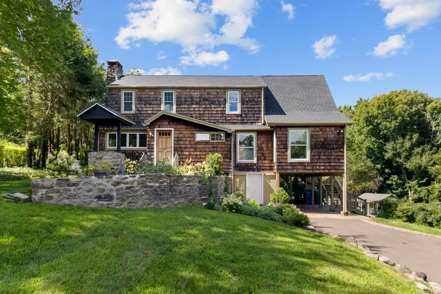 Experience the allure of this beautifully renovated vintage farmhouse, harmoniously blending classic charm with contemporary comforts. Set on nearly 5 acres, the property provides breathtaking views of serene gardens and woodlands. The home features a spacious open layout that connects the living and dining areas with the outdoors. Beautiful new Country kitchen with heightened ceilings to show exposed beams with all new high end GE Cafe Kitchen Appliances and breakfast nook. Remodeled walk-in pantry and wet bar. A four-season glass room offers an ideal setting for enjoying morning coffee or breakfast while relishing the year-round views. The covered deck is perfect for summer dining and includes a lower-level outdoor area with a covered space and swing for added relaxation. Inside, the cozy living room invites you to unwind by the fireplace. The finished lower level provides versatile space with two rooms suitable for crafts, play, a home office, or an in-law suite, complemented by direct access to the gardens and an expanded shed. The upper level boasts three bedrooms, including a master suite with a newly remodeled private bath and an additional office or study. A walk-up attic offers ample storage or potential for further development. Generator. Outside, the property features meticulously maintained gardens and woodlands, creating a tranquil retreat. Nearby, Chatfield Hollow and Cockaponsett State Forest offer excellent opportunities for hiking and biking