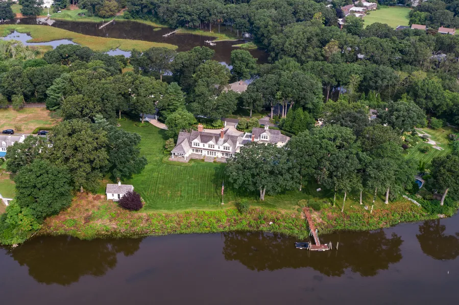 This very private, magnificent estate has spectacular vistas of North Cove and the Connecticut River down to Essex Harbor, which are protected by a forever land trust and enjoyed from every room. Sited on 2.8 acres of manicured grounds with a large gated carpark, this triple mint condition, custom Cape has shingle siding and a wood shingled roof. The first floor flows seamlessly with 10' ceilings, beautiful hardwood floors, and generously proportioned rooms. The marble floored foyer opens to the living room, where visitors get their first sight of the breathtaking views and are perhaps offered a drink from the concealed bar. A formal dining room and a mahogany paneled den are on either side of the living room, all three with access to a bluestone terrace that spans the length of the house. A coffered-ceilinged kitchen and family room have counter seating, a separate dining area, and ampl...