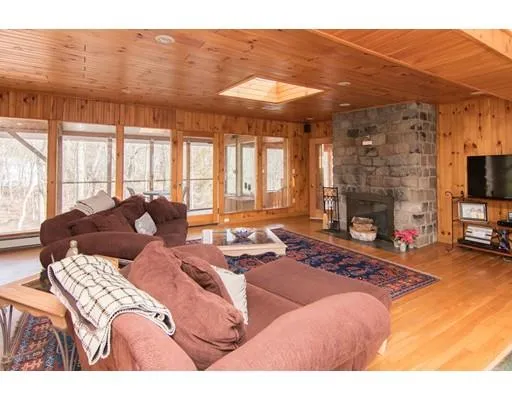 This Mid-Century Modern home is conveniently located and sited on a 1 acre corner parcel offering lovely views of your wooded lot. Completely gutted and renovated in 2001, the updated design provides an open concept living space taking advantage of the natural light afforded from the many windows and skylights. This woodland retreat offers hardwood flooring throughout, a great room with stone fireplace, a European/ Retro kitchen, family room with vaulted ceiling, office/den, and 3 bedrooms each with direct access to the back patio. The master retreat has a walk-in closet, fireplace and master bath. As an added bonus there is an office addition with separate entrance, reception area, sauna and full bath. Here is your opportunity to work and live in a park like setting. Enjoy modern living in the quaint New England town of Sherborn which is noted for its top rated schools and miles of conservation land.