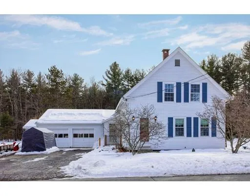Charming and comfortable three bedroom, 1.5 bath affordable antique on private landscaped level half acre. Warm welcoming family room with woodstove. Bright large dining room off updated open kitchen with stainless appliances and newer fixtures and lighting. Front formal living room/parlor. Upstairs three bedrooms and updated full bath. Beautiful original wideboard floors. Recent windows, new gutters, new paint inside/out. PLUS: Two bay garage with central office/workshop, 12x27 three season porch/sunroom, covered porch overlooking deck and in-ground pool. Transferable Tesla roof solar system. Private yard borders state land, trails and access to Squannacook River. Minutes from historic Townsend Center and Common, library, senior center and Meeting Hall..