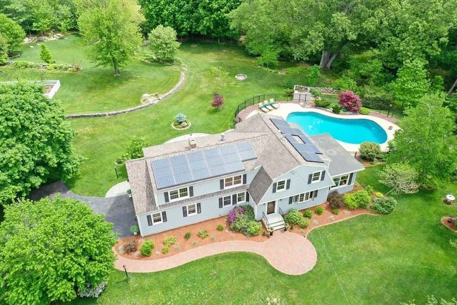 Beautiful home perfectly placed on exceptional 2.36 acre lot!This quintessential NE setting has hardscaping and plantings throughout the entire property AND custom gunite in ground pool,feels like a retreat all year long!Seller's designed home to bring the outside in with beautiful walls of windows. The open concept living/dining/sitting room offers the perfect gathering space off the updated EIK with granite counters, beverage/cooling draws and lovely sun filled dining area fireplace. Designated laundry room and bath completes first floor.Second floor has 4BR's and 2FB, master suite boasts 2 large rooms, private bath and 6x15 WIC.This custom gambrel feels like home from the minute you set your eyes on its mature landscaping including: blue stone patio, gunite pool, stone walls, potting shed and lovely deck. You need to see this home to capture the beauty. 2 Pioneer Way a wonderful place to call home conveniently located to Routes 2, 3 and 495, top-notch schools and community.