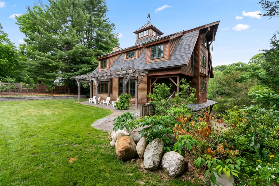 Designed by the highly esteemed Bensonwood Homes & built by the award-winning T.V. show This Old House, this timber frame home is Silver LEED-certified, eco-friendly with solar-thermal systems & blends rustic craftsmanship with industrial sophistication. The rustic & charming interior creates a harmonious relationship between intimate & cozy with an open floor plan. Reclaimed wood, a dream Chef's kitchen & a stone fireplace builds an unparalleled ambiance. Four second floor bedrooms, flanked by an industrial iron staircase, add an element of uniqueness to this incredibly special home. Downstairs features an intimate media room & opens out to a beautiful patio featuring custom stonework with an integrated fire pit. The backyard boasts a beautiful acre of land with a handcrafted bridge over a babbling brook, leading into the cul-de-sac of the Stoney Brook neighborhood, with access to the L...