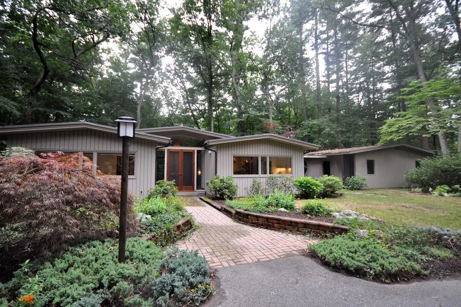Walls of glass, reclaimed wood, stone fireplaces, tall angled rooflines & a fresh, open floorplan are just a few of the exciting features in this 4 bedroom Contemporary. A brilliant kitchen gut-reno (2019) saw removal of walls, increased storage & workspace - all graced w new white cabinets & sleek white quartz counters. Lofty DR ceiling w 2 sets of french doors lead to 20x15 patio - the perfect summer entertaining setting! LR w vaulted, beamed ceiling, 17' wall of glass, oversized fieldstone fp & 25' wall of warm wood creates drama & warmth. Walk out LL has 2 brs, full ba & fabulous fp'd FR as well as an added surprise of a custom built work station nestled in its own private spot. Peaceful acre lot in Zen-like setting surrounded by nature...part of a quiet cul-de-sac neighborhood of more expensive homes. This sophisticated gem affords the perfect balance of comfort & calm that successf...