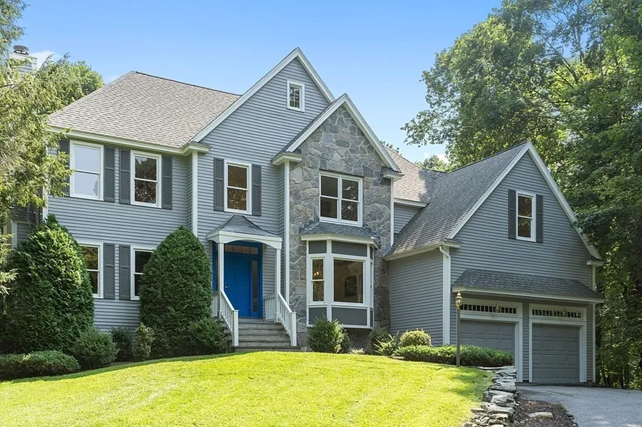 Contemporary colonial on private lot in a popular north Wayland neighborhood close to town center. Large open concept main level with 9' ceilings. Eat in kitchen with newer appliances, spacious step down family room with 2 story stone front gas fireplace and sliders to large deck, formal living room, formal dining room and home office.. Stairway is open to front foyer and family room. Upper level features 4 bedrooms, primary bedroom suite has 2 walk in closets, office or exercise room, large bath with shower and tub. Unfinished basement has extra high ceiling height, large walk in cedar closet, and large walk in storage closet. Garage is wired for electric vehicle chargers.