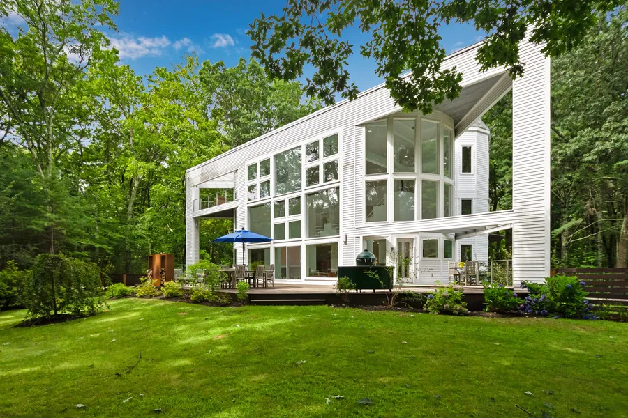 Completely remodeled sleek custom contemporary privately set amongst 4+ acres of landscaped property! Walls of glass, clean lines, towering ceilings, and sharp angles coupled with rounded walls make this impressive home truly one of a kind. Step into the brand new chef s kitchen that overlooks an open concept first floor boasting a three-story family room flooded with sunlight, living and dining room spaces, and more! Venture up the staircase to a second floor featuring generously sized bedrooms and unique rounded office space. The third floor is perfectly set with a large primary bedroom, walk-in closet, dream-like custom bathroom, and an additional office space surrounded by windows and a turret ceiling. Enjoy coffee on the private third floor porch, ideal for crisp fall mornings. Outdoor space at its finest with an oversized deck perfect for entertaining large groups. With dramatic architectural flair and an abundance of natural light, this unique property is not to be missed!