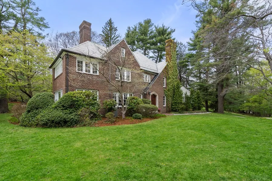 Perfectly positioned at the end of a long driveway, this stunning brick & slate Tudor Revival style residence is sited on nearly an acre and half of lush grounds. This two-story hip-roofed structure w/multiple gables & entrance w/stonework surround was designed by noted architect Edward Hennan. A beautifully appointed board & batten foyer with a graceful stairway welcomes you to this 13 + room residence. Additional rooms on the first floor include a LR room w/fireplace, sun room, formal DR , library w/fireplace, sunny chefs kitchen with newer appliances, a family room with cathedral ceiling, built-ins and views of patio and sweeping yard bordered by a stone wall. The second floor has a primary suite with fireplace, walk in closet and sitting room/office. Three additional large bedrooms & guest bath. The third floor has two charming bedrooms & full bath. The lower level features a media room w/drop down screen, kitchenette, newer bath. Two car attached garage w/EV charging station.