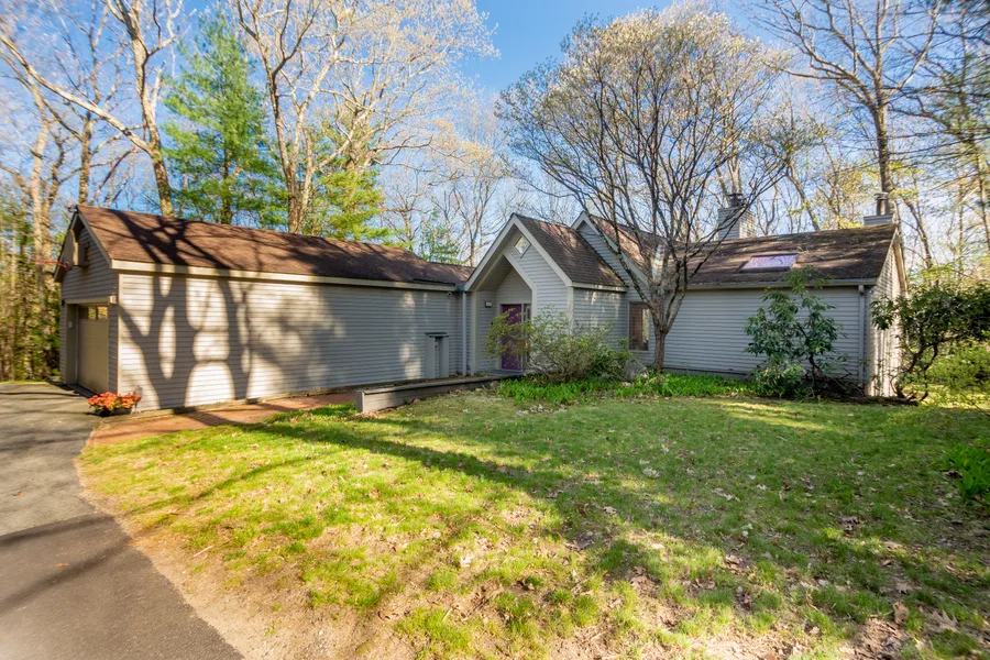 This appealing contemporary home offering a one floor living option is ideally located at the end of a cul-de-sac, with a welcoming, open floor plan and first floor Main suite. Sunlight streams through the walls of glass, connecting the home to its natural environment, framing the generous Living Room/Dining Room space accented by a fireplace and built-in bookcases. The kitchen offers ample counter space, SS appliances and a laundry conveniently tucked to one side. The lower level offers two additional bedrooms and family room with wood stove and sliding glass doors that access the surrounding woodlands. Enjoy summer evenings and views from your private patio enhanced by stone walls or quiet time in the corner office or library space framed by windows. A great condo alternative where the Home Owners Association takes care of snow plowing and maintenance of the common grounds. Easy living is yours: wander nearby conservation trails and enjoy exceptionally convenient commuting access.