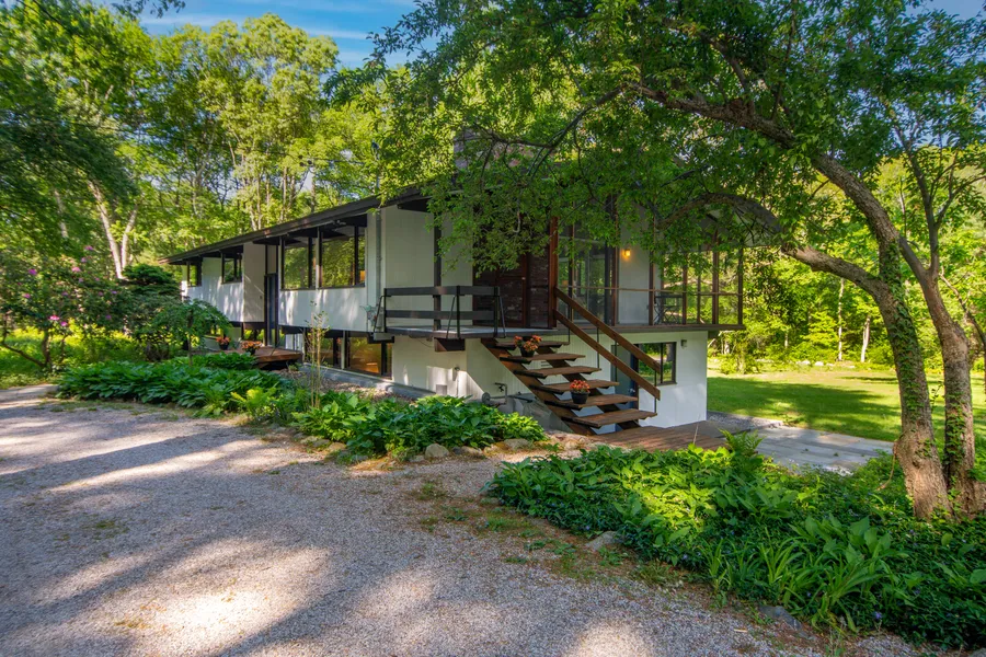 A private driveway leads to this classic Mid-Century Modern Deck House surrounded by four magical acres of land. Enjoy iconic beamed soaring cathedral ceilings in the living room with its broad central brick fireplace, where walls of glass connect you to the surrounding fields. Relax on the adjoining screened-in porch to enjoy peaceful views of the surrounding meadows. Generously proportioned bedrooms on the upper level are complemented by an open floorplan on the lower level that includes a fully renovated white kitchen with quartz countertops and stainless-steel appliances opening to an ample dining area and family room, creating a harmonious environment for cooking and gathering together. Fully renovated in 2019, enjoy newer bathrooms and systems (roof, heating, cooling, generator and septic). A rare turnkey product offering privacy and tranquility. All ideally located on a peaceful c...