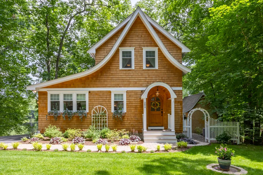 Welcome to Storybook Cottage, a custom home nestled in an idyllic setting offering a beautifully landscaped yard. Stone walls, perennial gardens, and a hardscaped patio overlook the private dock and 175 ft of water frontage on Duck Pond. Step through the arched doorway to find a nicely appointed kitchen with granite counters and SS appliances, a living area with a cozy gas fireplace, and a half bath. The family room wrap-around windows offer loads of natural light, showcasing the custom-built wall unit. Hardwood flooring runs through the main level and custom lighting can be found throughout the home. Two bedrooms and a custom full bath are located upstairs, along with the laundry. A separate home office and loft space provide a peaceful place to work from home while overlooking the pond. The 2-car garage features automatic doors that swing outward and additional storage. Every space has...