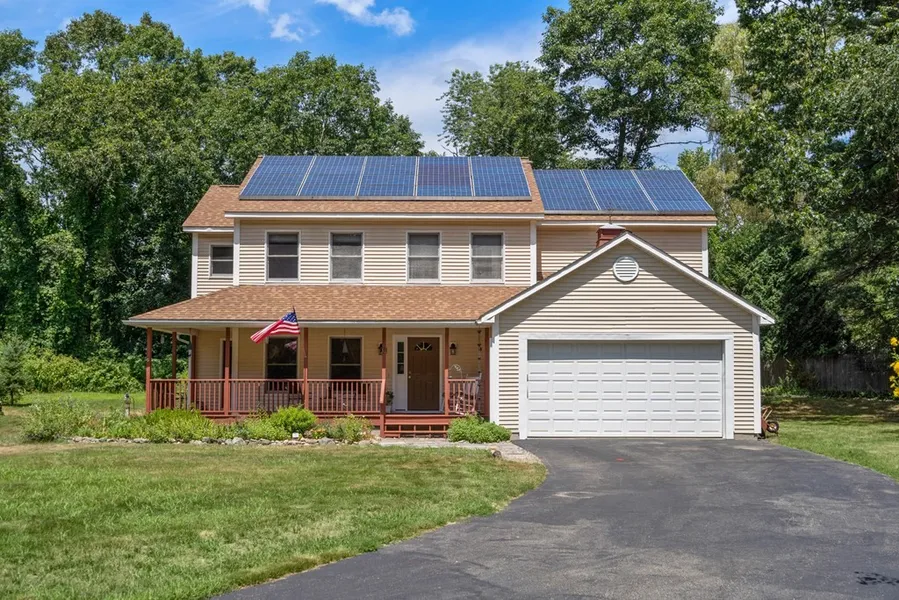 Claypit Hill! This privately sited home on 1+ acres of level, open land has profitable solar panels! Recent painting throughout the first floor provides a fresh feel. Everything is convenient to the kitchen, family room with gas fireplace and door out to the patio and spacious lawn. The second floor primary bedroom en suite has ample closet space, full bath with a whirlpool tub, and shower. Three family bedrooms, full bath and laundry are also located on the second floor. The garage is heated and a full basement provides ample storage.