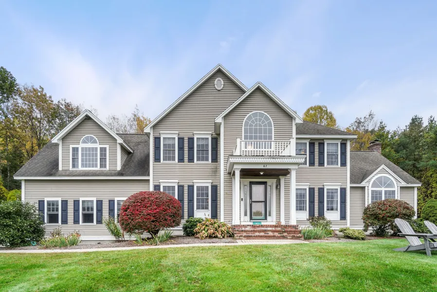 Welcome to 67 Sky Top Ln in Dunstable MA a 4 bed 3 bath Colonial home. This property sits high on 2.5 acres abutting hundreds of acres of conservation land and trails at the end of a cul- de sac in the sought after meadow view estates neighborhood. Plenty of room here as the 1st floor offer a large eat in kitchen with granite counters, stainless steel appliances, peninsula and wet bar which leads to a front to back family room with cathedral ceilings and pellet fireplace. A formal wianscott dining room, traditional living room / office, 1/2 bath and laundry complete this level. Upstairs includes 3 large bedrooms a full bath and a massive primary bedroom with vaulted ceilings, sky lights and spa inspired en suite bath with double vanity, glass shower and jacuzzi tub. The finished basement offers tons of extra space and is perfect for entertaining and includes a wood burning fireplace, ful...