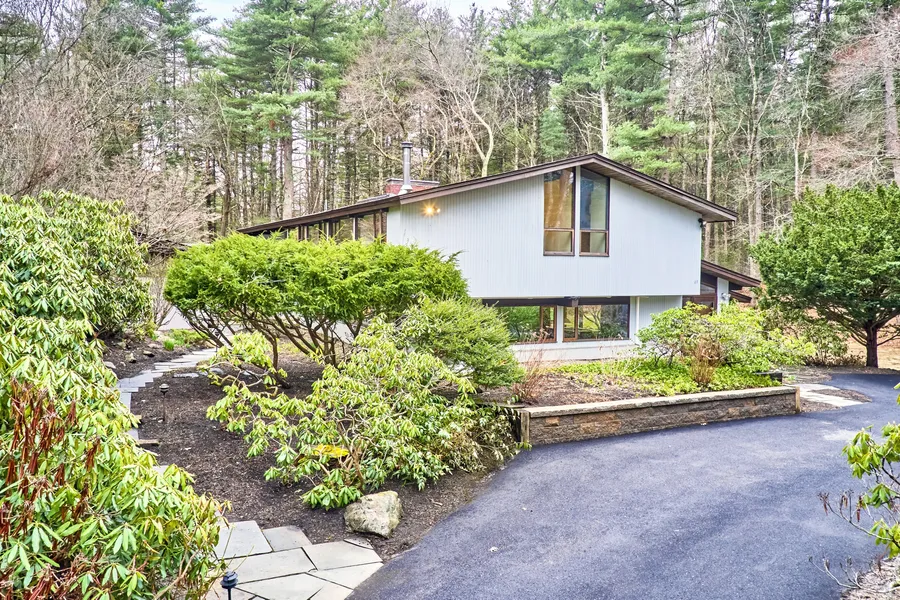 Never before on the market! This custom Deck House built in 1964 in the coveted Stonehedge neighborhood was designed to harmonize with its natural surroundings. Featuring iconic mid-century modern elements—expansive glass walls, open floor plan, mahogany cabinetry, and exposed beams—this four/five bedroom, three bath residence is sited in a three-acre oasis abutting untold acreas of conservation land. The dramatic two-story living room is anchored by a floor-to-ceiling brick fireplace, while the kitchen with original mahogany cabinetry connects to the dining room and a sunroom addition (c. 1989). Multiple living areas -- a playroom with woodburning stove and an entertainment room (c.1999) -- offer flexible spaces for work or leisure. A detached two-car garage includes a one-bedroom apartment, workshop and kennel/stable area. Additional features: generator, stone patio, and mature landsca...